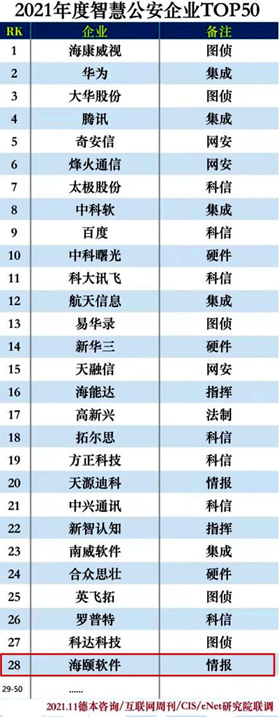 11月24日,互联网周刊发布2021年度智慧公安企业TOP50,烟台海颐软件公司上榜。