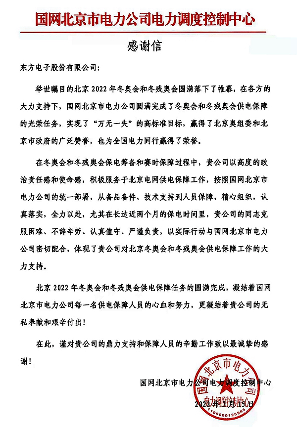 截至目前共有股份公司收到来自国网北京市电力公司、国网天津市电力分公司、国网冀北电力有限公司张家口供电公司、国网冀北廊坊供电公司的感谢信;威思顿公司收到来自国网冀北电力有限公司张家口供电公司的感谢信;国网中电公司收到来自国网冀北电力有限公司张家口供电公司的感谢信;玉麟公司收到来自中铁二局集团有限公司的感谢信。
